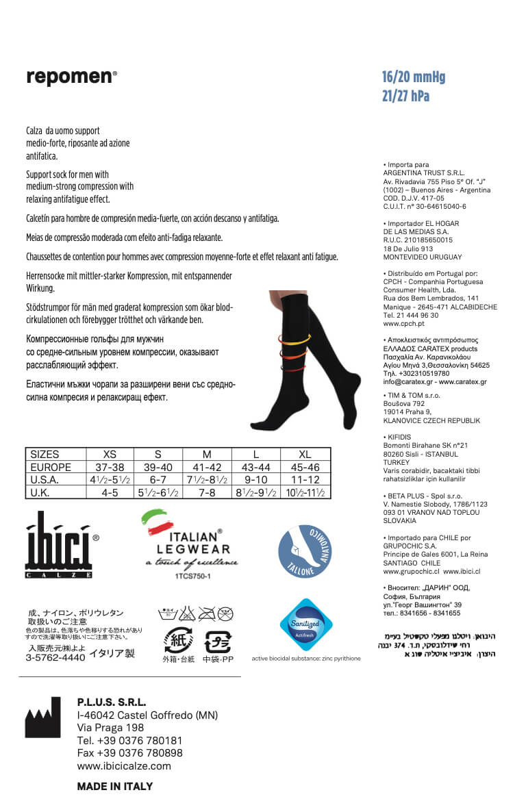 Meias de compressão média-forte, com efeito anti-fadiga e relaxante, cós suave e confortável, e calcanhar anatómico.