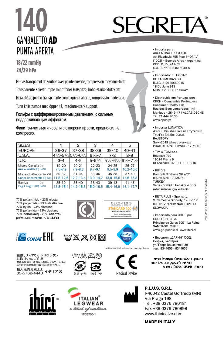 Meias pela altura do joelho com suporte médio-forte, textura de favo de mel transparente, calcanhar anatómico e biqueira aberta.