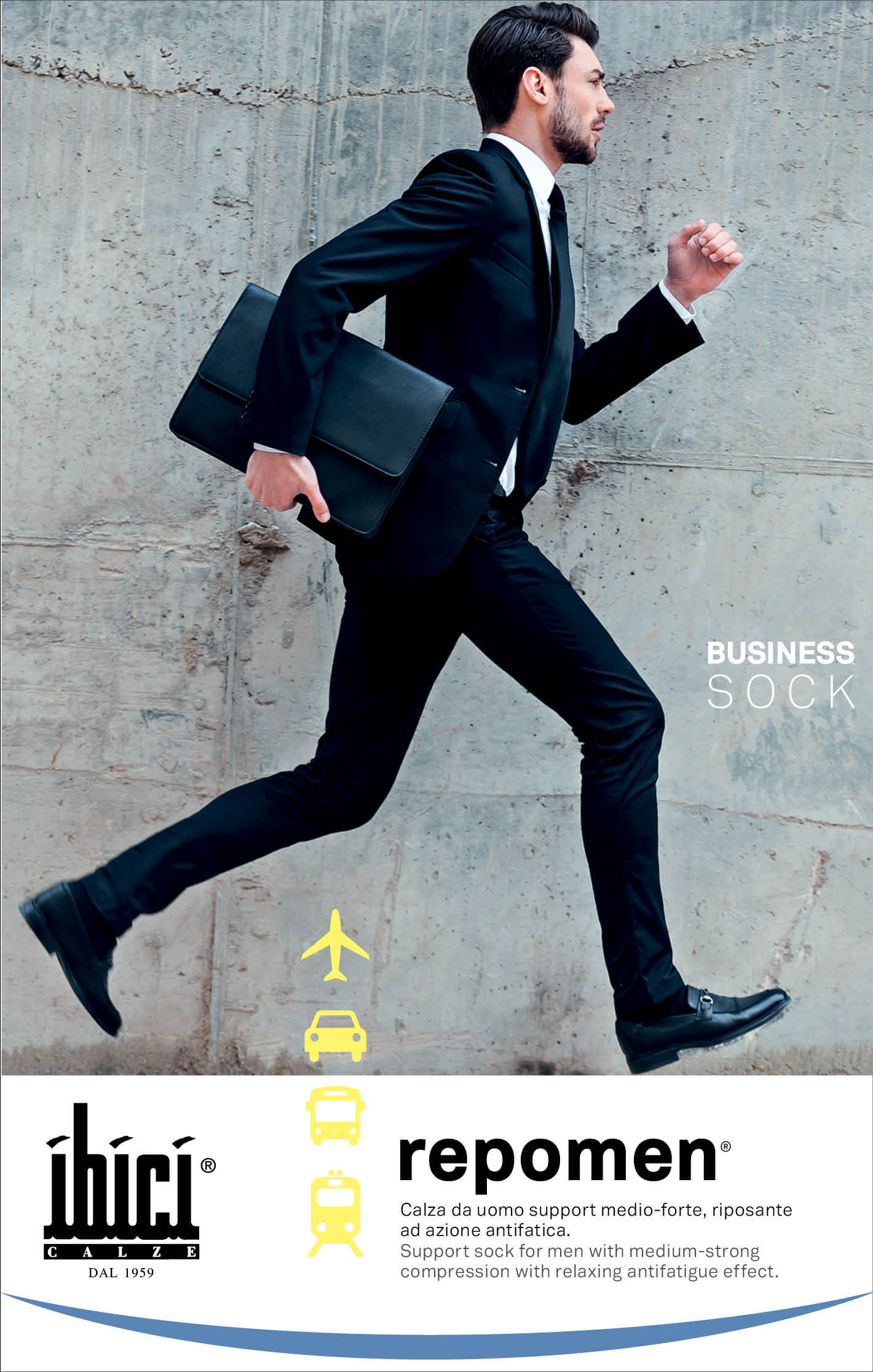 Meias de compressão média-forte, com efeito anti-fadiga e relaxante, cós suave e confortável, e calcanhar anatómico.